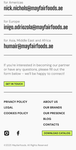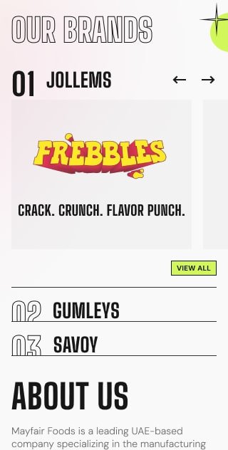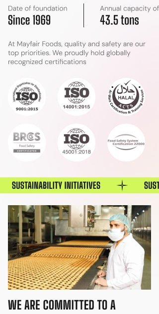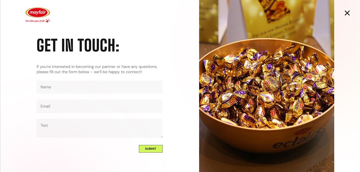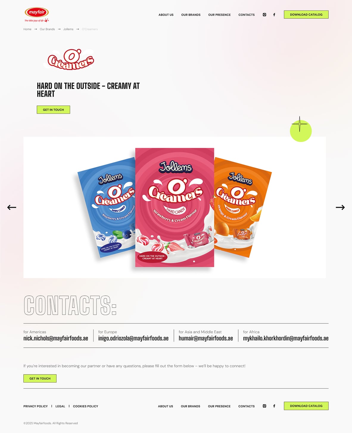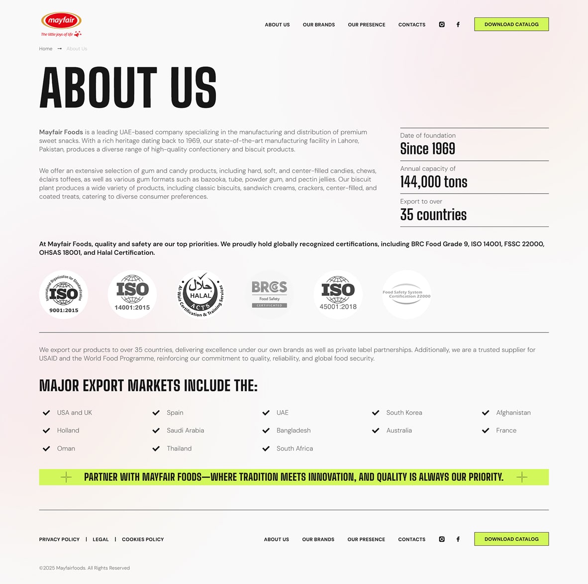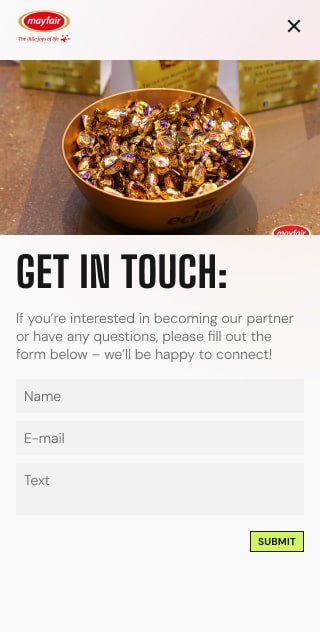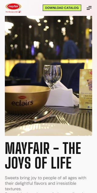 Mayfair Foods — міжнародна компанія з головним офісом в ОАЕ. Більше 50 років компанія створює найсмачніші солодощі — від цукерок і жувальних гумок до ніжного печива з начинками. Виробництво розташоване в Пакистані, а продукція щодня тішить споживачів у понад 35 країнах, зокрема в США, Великій Британії, ОАЕ, Південній Кореї та Австралії.